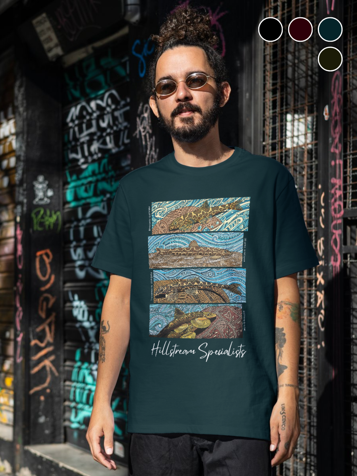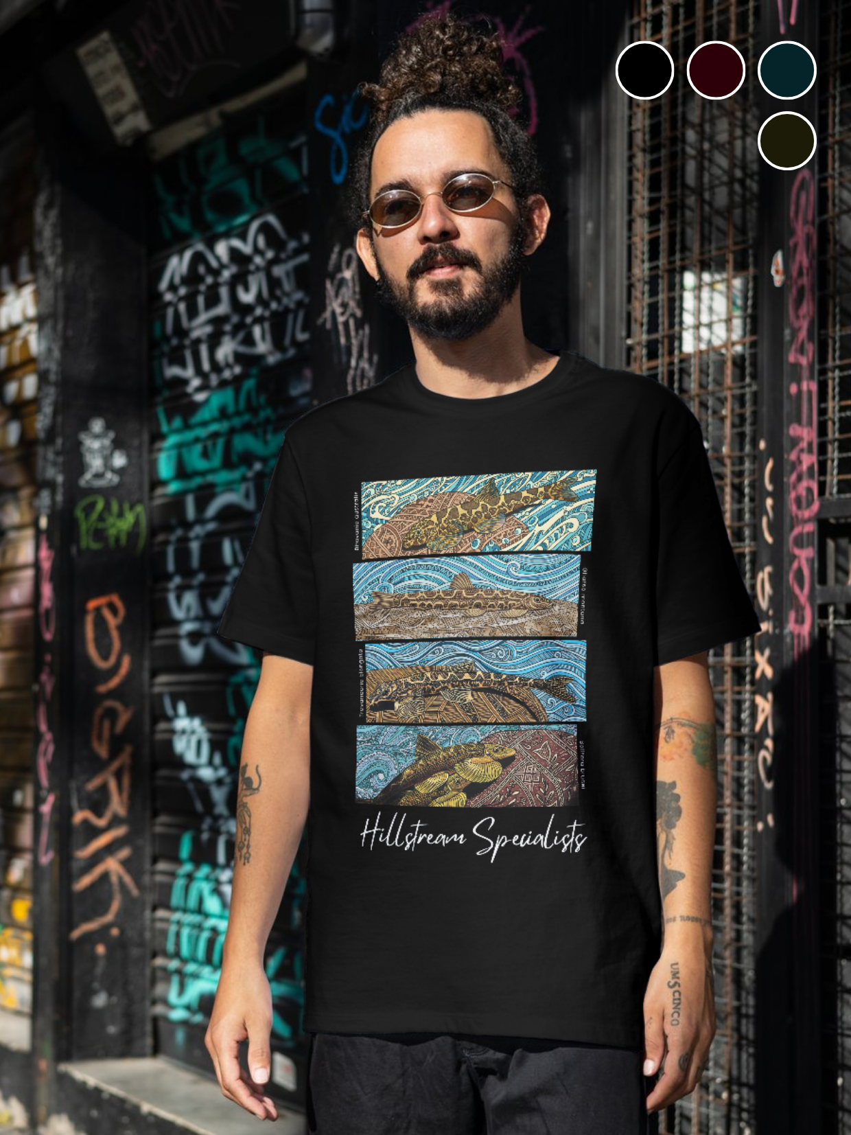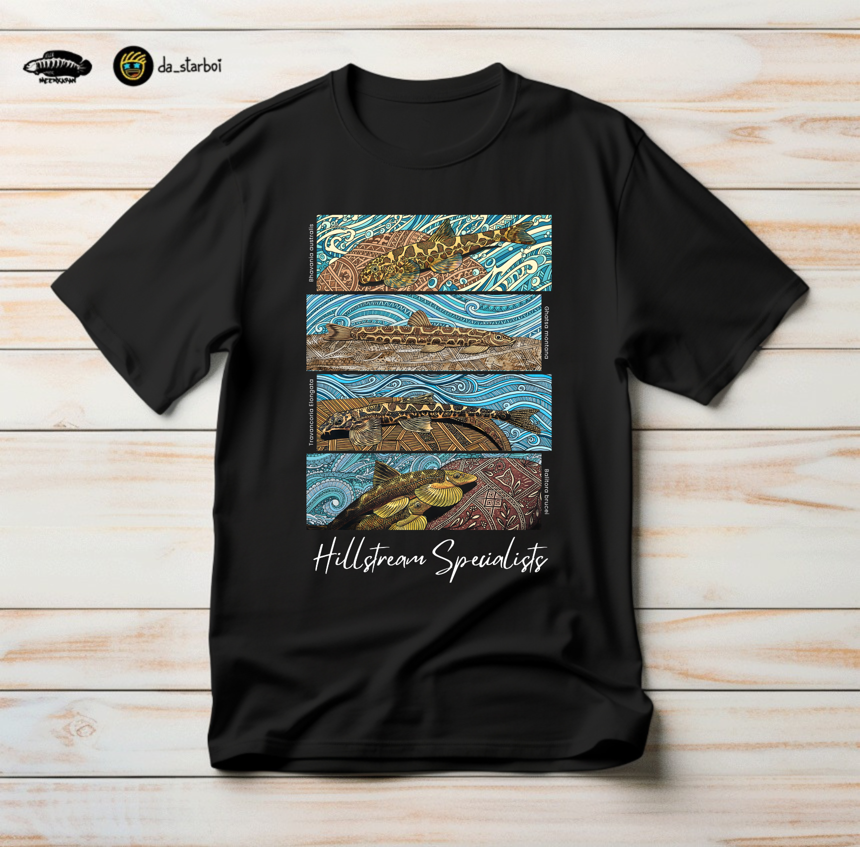 The four genera of Indian hillstream loaches adapted to fast-flowing, oxygen-rich streams. Rendered in Madhubani style, they celebrate the beauty and resilience of our mountain streams